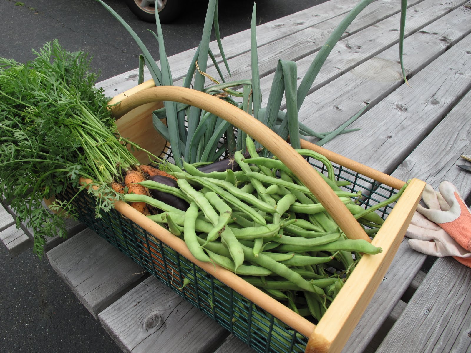 Not tremendously huge, but we’ll take ’em. I definitely need to read up on how to better support and encourage these for next year. Next up were the green beans and as you can see in the veggie carrier, we had a few.